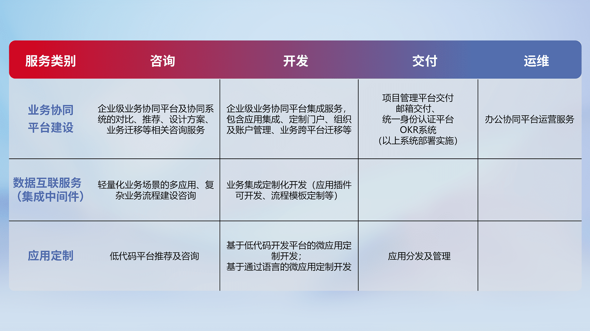 针对钉钉、、、、企微、、、、IDaas等平台级产品提供产品的规划、、、、方案、、、、交付、、、定制化开发等服务,,,实现如统一协同办公、、、、智能客户服务、、、混合会议管理、、、智能数据查询、、、等业务场景,,,实现数字化转型。。。