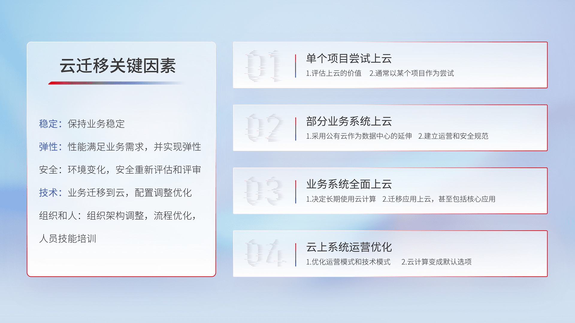 结合实际业务,,,从规划设计、、、云平台选型、、云原生改造、、、、数据迁移、、、集成交付,,迁移全过程为客户识别最佳上云路径,,做好风险识别管理,,设计网络架构、、身份权限、、、安全审计合规、、操作审计、、、、日志审计、、监控告警策略、、、多站点容灾设计等,,,,对云上基础设施进行整体规划,,,,提升IT治理水平,,,,以满足弹性、、高可用、、、、高性能的需求。。