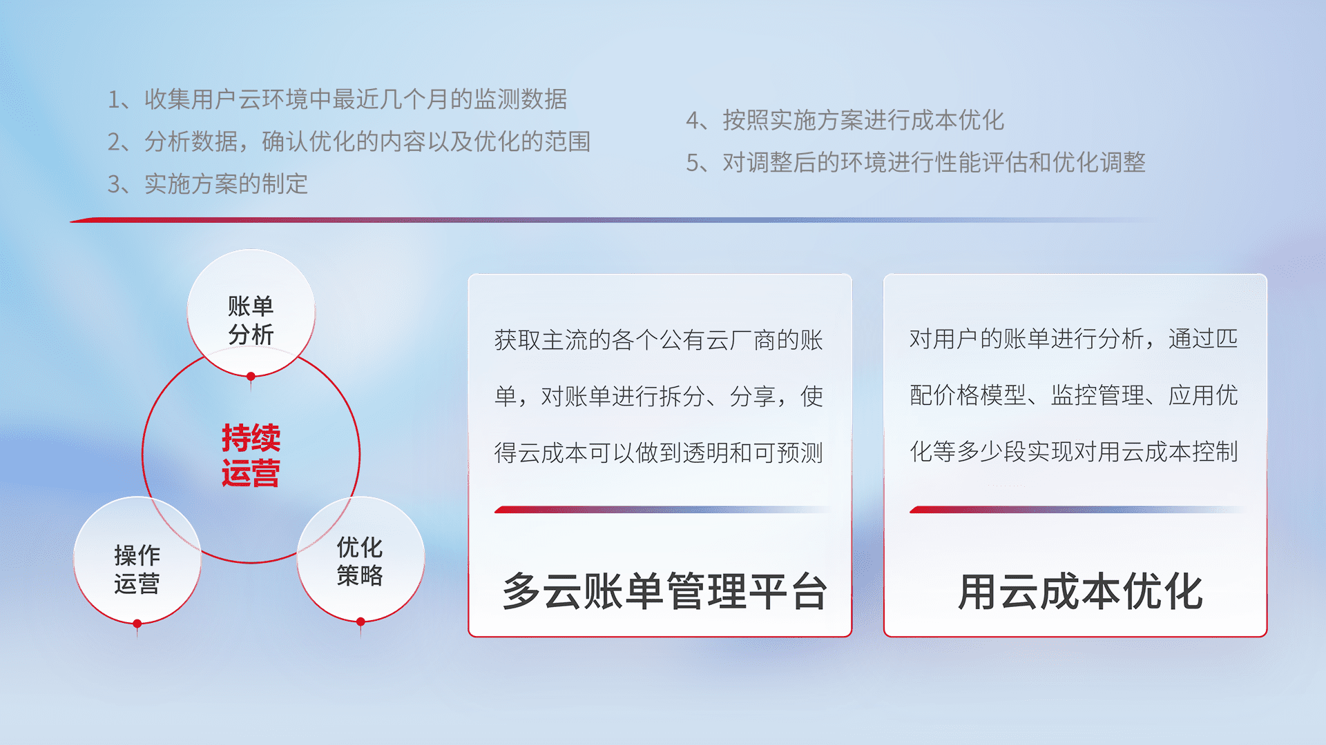 通过多云纳管,,,以统一的资源数据模型把客户的云资源进行抽象和封装,,,进而实现对多云资源的统一操作,,,保障云资源管理的可靠性、、稳定性与可用性。。。。量身定制化运维内容,,,,配置、、、开发运维、、、补丁管理、、、、备份、、、、监控、、、认证和访问管理、、审计和日常巡检等,,保障在用云过程中的可靠度,,,稳定度以及高可用率。。